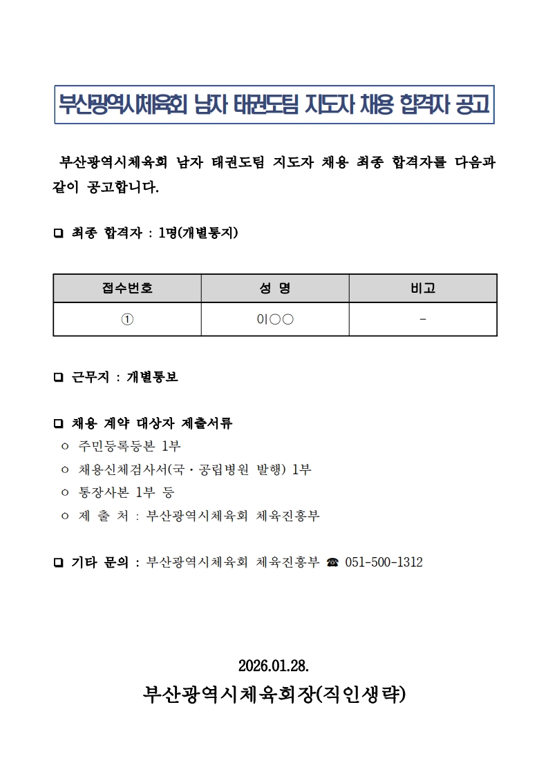 부산광역시체육회 남자 태권도팀 지도자 채용 최종 합격자를